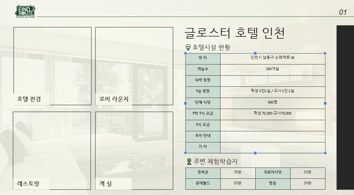 넓은 로비와 단체 이용에 적합한 공간 구성은 학생들에게 편안함을, 인솔자에게는 안정적인 운영 환경을 선사합니다.